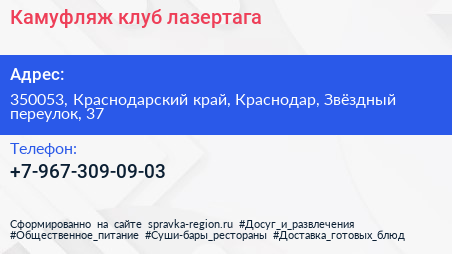 Камуфляж, клуб лазертага по адресу 350053, Краснодарский край, Краснодар, Звёздный переулок, 37 в дальнейшем Организация, размещена в следующих категориях: