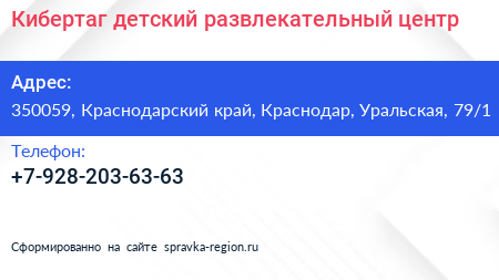 Кибертаг, детский развлекательный центр по адресу 350059, Краснодарский край, Краснодар, Уральская, 79/1 в дальнейшем Организация, размещена в следующих категориях: