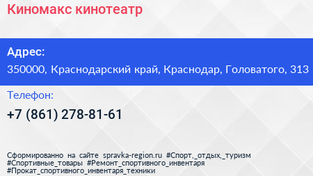 Киномакс, кинотеатр по адресу 350000, Краснодарский край, Краснодар, Головатого, 313 в дальнейшем Организация, размещена в следующих категориях: