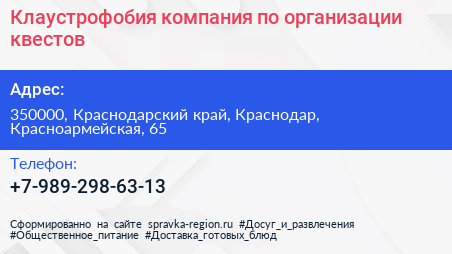 Клаустрофобия, компания по организации квестов по адресу 350000, Краснодарский край, Краснодар, Красноармейская, 65 в дальнейшем Организация, размещена в следующих категориях: