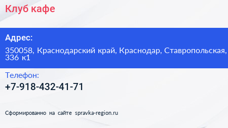Клуб, кафе по адресу 350058, Краснодарский край, Краснодар, Ставропольская, 336 к1 в дальнейшем Организация, размещена в следующих категориях:
