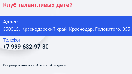 Клуб талантливых детей по адресу 350015, Краснодарский край, Краснодар, Головатого, 355 в дальнейшем Организация, размещена в следующих категориях: