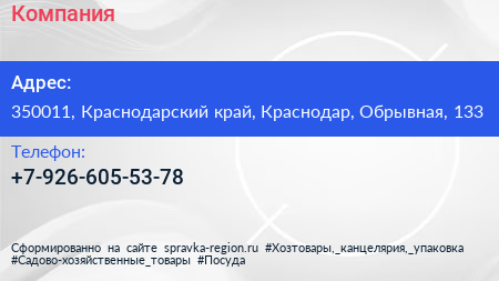 Компания по адресу 350011, Краснодарский край, Краснодар, Обрывная, 133 в дальнейшем Организация, размещена в следующих категориях: