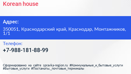 Korean house по адресу 350051, Краснодарский край, Краснодар, Монтажников, 1/1 в дальнейшем Организация, размещена в следующих категориях: