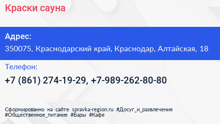 Краски, сауна по адресу 350075, Краснодарский край, Краснодар, Алтайская, 18 в дальнейшем Организация, размещена в следующих категориях: