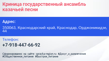 Криница, государственный ансамбль казачьей песни по адресу 350063, Краснодарский край, Краснодар, Орджоникидзе, 44 в дальнейшем Организация, размещена в следующих категориях: