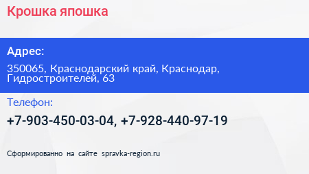 Крошка япошка по адресу 350065, Краснодарский край, Краснодар, Гидростроителей, 63 в дальнейшем Организация, размещена в следующих категориях: