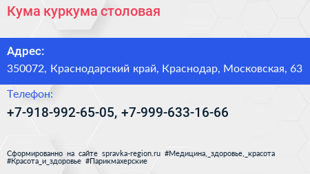 Кума-куркума, столовая по адресу 350072, Краснодарский край, Краснодар, Московская, 63 в дальнейшем Организация, размещена в следующих категориях: