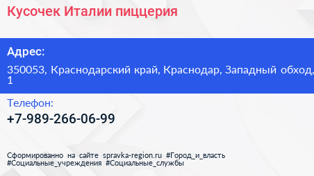Кусочек Италии, пиццерия по адресу 350053, Краснодарский край, Краснодар, Западный обход, 1 в дальнейшем Организация, размещена в следующих категориях: