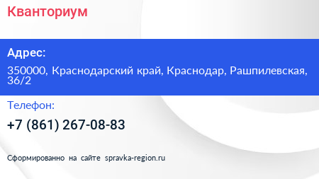 Кванториум по адресу 350000, Краснодарский край, Краснодар, Рашпилевская, 36/2 в дальнейшем Организация, размещена в следующих категориях: