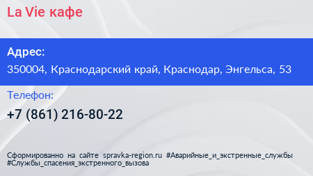 La Vie, кафе по адресу 350004, Краснодарский край, Краснодар, Энгельса, 53 в дальнейшем Организация, размещена в следующих категориях: