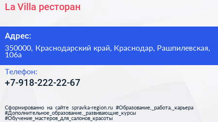 La Villa, ресторан по адресу 350000, Краснодарский край, Краснодар, Рашпилевская, 106а в дальнейшем Организация, размещена в следующих категориях: