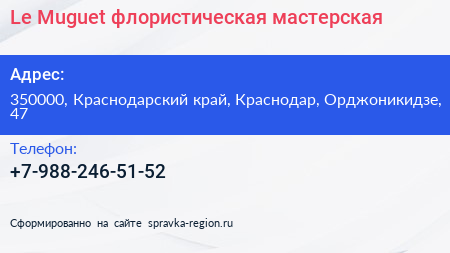 Le Muguet, флористическая мастерская по адресу 350000, Краснодарский край, Краснодар, Орджоникидзе, 47 в дальнейшем Организация, размещена в следующих категориях: