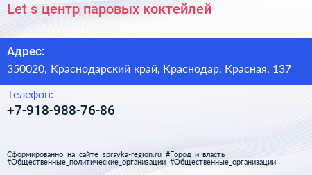 Let`s, центр паровых коктейлей по адресу 350020, Краснодарский край, Краснодар, Красная, 137 в дальнейшем Организация, размещена в следующих категориях: