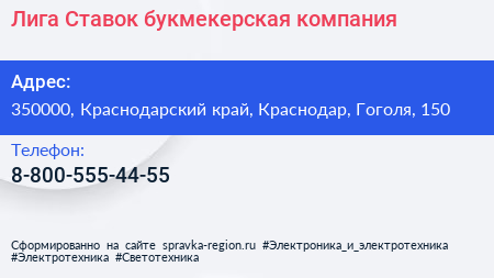 Лига Ставок, букмекерская компания по адресу 350000, Краснодарский край, Краснодар, Гоголя, 150 в дальнейшем Организация, размещена в следующих категориях: