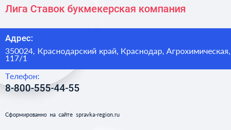 Лига Ставок, букмекерская компания по адресу 350024, Краснодарский край, Краснодар, Агрохимическая, 117/1 в дальнейшем Организация, размещена в следующих категориях: