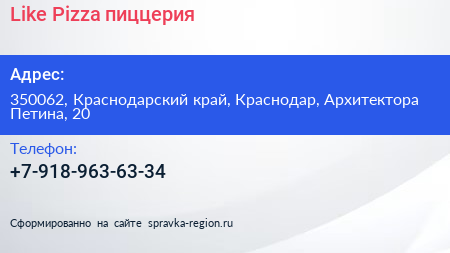 Like Pizza, пиццерия по адресу 350062, Краснодарский край, Краснодар, Архитектора Петина, 20 в дальнейшем Организация, размещена в следующих категориях: