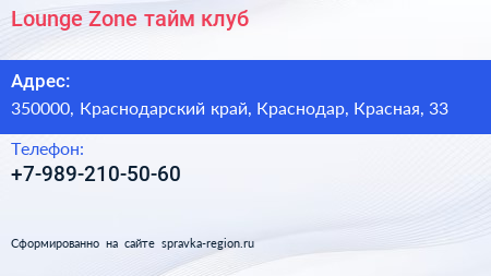 Lounge Zone, тайм-клуб по адресу 350000, Краснодарский край, Краснодар, Красная, 33 в дальнейшем Организация, размещена в следующих категориях: