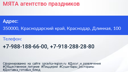 МЯТА, агентство праздников по адресу 350000, Краснодарский край, Краснодар, Длинная, 100 в дальнейшем Организация, размещена в следующих категориях: