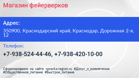 Магазин фейерверков по адресу 350900, Краснодарский край, Краснодар, Дорожная 2-я, 12 в дальнейшем Организация, размещена в следующих категориях: