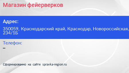 Магазин фейерверков по адресу 350059, Краснодарский край, Краснодар, Новороссийская, 234/1Б в дальнейшем Организация, размещена в следующих категориях: