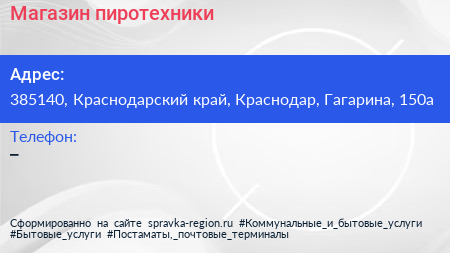 Магазин пиротехники по адресу 385140, Краснодарский край, Краснодар, Гагарина, 150а в дальнейшем Организация, размещена в следующих категориях: