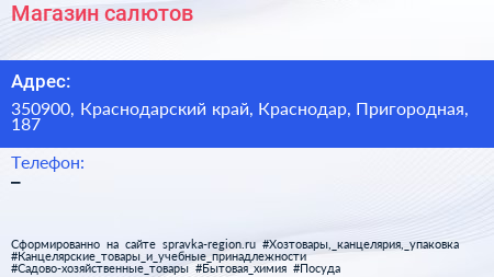 Магазин салютов по адресу 350900, Краснодарский край, Краснодар, Пригородная, 187 в дальнейшем Организация, размещена в следующих категориях: