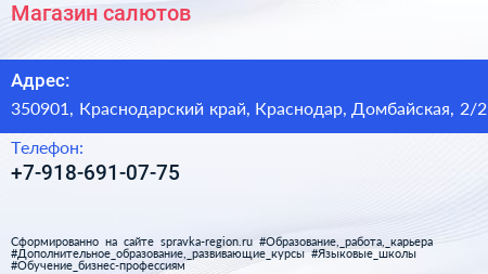 Магазин салютов по адресу 350901, Краснодарский край, Краснодар, Домбайская, 2/2 в дальнейшем Организация, размещена в следующих категориях: