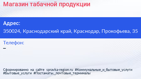Магазин табачной продукции по адресу 350024, Краснодарский край, Краснодар, Прокофьева, 35 в дальнейшем Организация, размещена в следующих категориях: