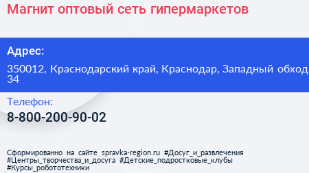 Магнит оптовый, сеть гипермаркетов по адресу 350012, Краснодарский край, Краснодар, Западный обход, 34 в дальнейшем Организация, размещена в следующих категориях: