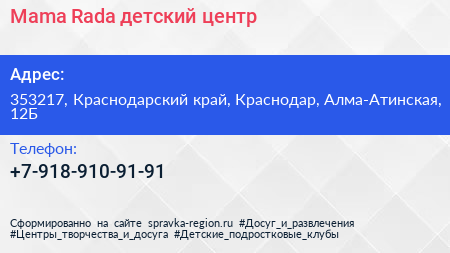 Mama Rada, детский центр по адресу 353217, Краснодарский край, Краснодар, Алма-Атинская, 12Б в дальнейшем Организация, размещена в следующих категориях: