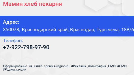 Мамин хлеб, пекарня по адресу 350078, Краснодарский край, Краснодар, Тургенева, 189/6 в дальнейшем Организация, размещена в следующих категориях: