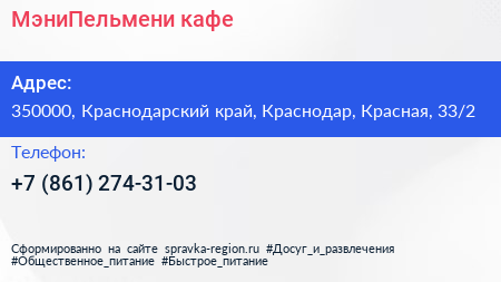 МэниПельмени, кафе по адресу 350000, Краснодарский край, Краснодар, Красная, 33/2 в дальнейшем Организация, размещена в следующих категориях:
