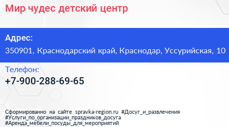 Мир чудес, детский центр по адресу 350901, Краснодарский край, Краснодар, Уссурийская, 10 в дальнейшем Организация, размещена в следующих категориях: