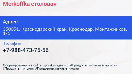 Morkoffka, столовая по адресу 350051, Краснодарский край, Краснодар, Монтажников, 1/1 в дальнейшем Организация, размещена в следующих категориях:
