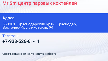 Mr.Sm, центр паровых коктейлей по адресу 350901, Краснодарский край, Краснодар, Восточно-Кругликовская, 94 в дальнейшем Организация, размещена в следующих категориях: