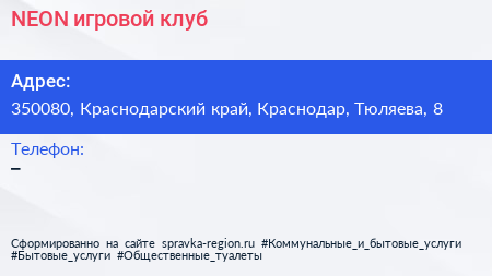 NEON, игровой клуб по адресу 350080, Краснодарский край, Краснодар, Тюляева, 8 в дальнейшем Организация, размещена в следующих категориях: