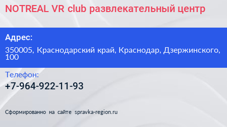 NOTREAL VR club, развлекательный центр по адресу 350005, Краснодарский край, Краснодар, Дзержинского, 100 в дальнейшем Организация, размещена в следующих категориях: