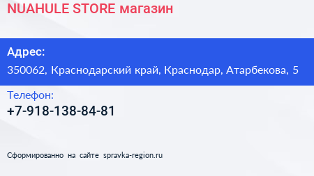 NUAHULE STORE, магазин по адресу 350062, Краснодарский край, Краснодар, Атарбекова, 5 в дальнейшем Организация, размещена в следующих категориях: