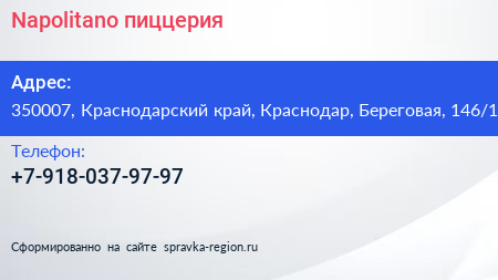 Napolitano, пиццерия по адресу 350007, Краснодарский край, Краснодар, Береговая, 146/1 в дальнейшем Организация, размещена в следующих категориях: