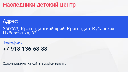 Наследники, детский центр по адресу 350063, Краснодарский край, Краснодар, Кубанская Набережная, 33 в дальнейшем Организация, размещена в следующих категориях: