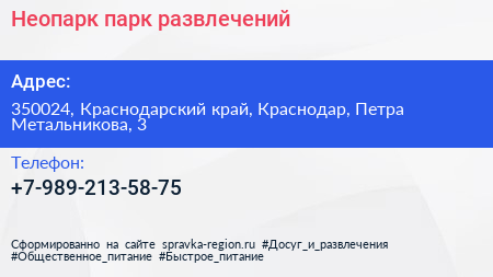 Неопарк, парк развлечений по адресу 350024, Краснодарский край, Краснодар, Петра Метальникова, 3 в дальнейшем Организация, размещена в следующих категориях: