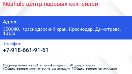 Nuahule, центр паровых коктейлей по адресу 350040, Краснодарский край, Краснодар, Димитрова, 131/2 в дальнейшем Организация, размещена в следующих категориях: