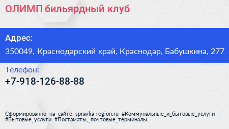 ОЛИМП, бильярдный клуб по адресу 350049, Краснодарский край, Краснодар, Бабушкина, 277 в дальнейшем Организация, размещена в следующих категориях: