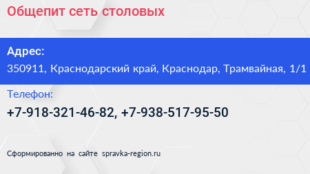 Общепит, сеть столовых по адресу 350911, Краснодарский край, Краснодар, Трамвайная, 1/1 в дальнейшем Организация, размещена в следующих категориях: