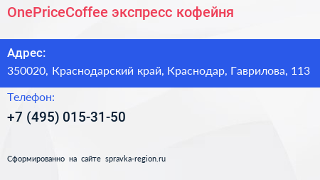 OnePriceCoffee, экспресс-кофейня по адресу 350020, Краснодарский край, Краснодар, Гаврилова, 113 в дальнейшем Организация, размещена в следующих категориях: