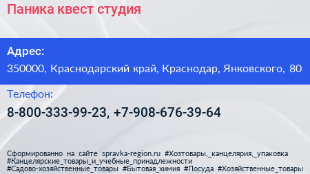 Паника, квест-студия по адресу 350000, Краснодарский край, Краснодар, Янковского, 80 в дальнейшем Организация, размещена в следующих категориях: