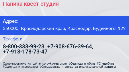 Паника, квест-студия по адресу 350000, Краснодарский край, Краснодар, Будённого, 129 в дальнейшем Организация, размещена в следующих категориях: