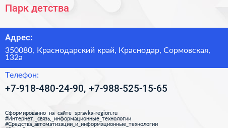 Парк детства по адресу 350080, Краснодарский край, Краснодар, Сормовская, 132а в дальнейшем Организация, размещена в следующих категориях: