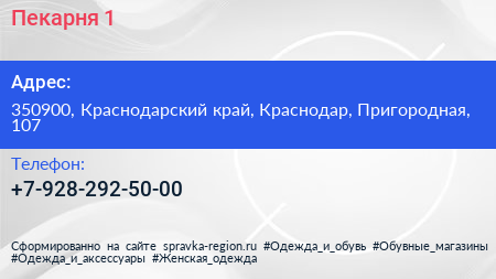Пекарня №1 по адресу 350900, Краснодарский край, Краснодар, Пригородная, 107 в дальнейшем Организация, размещена в следующих категориях: